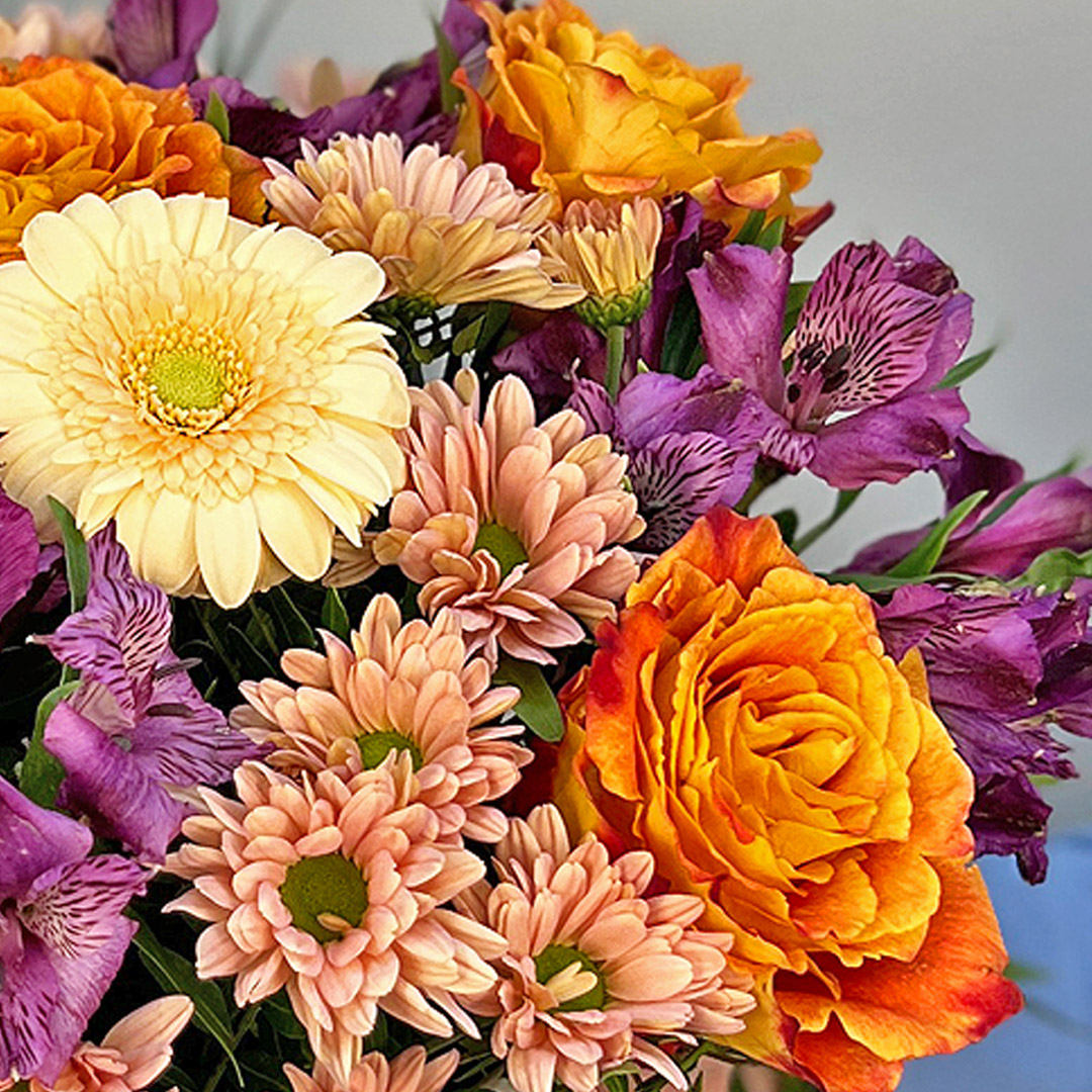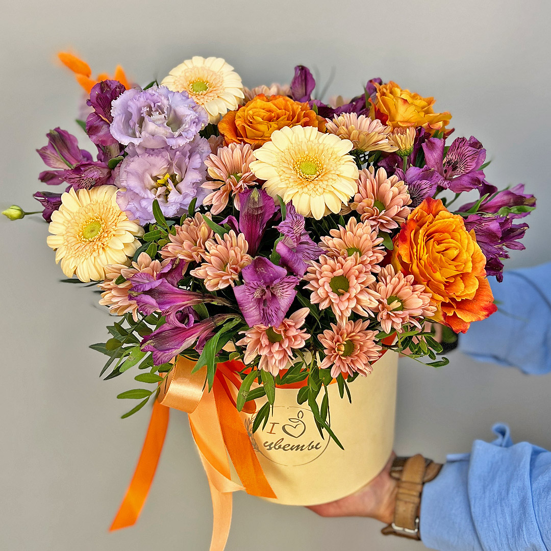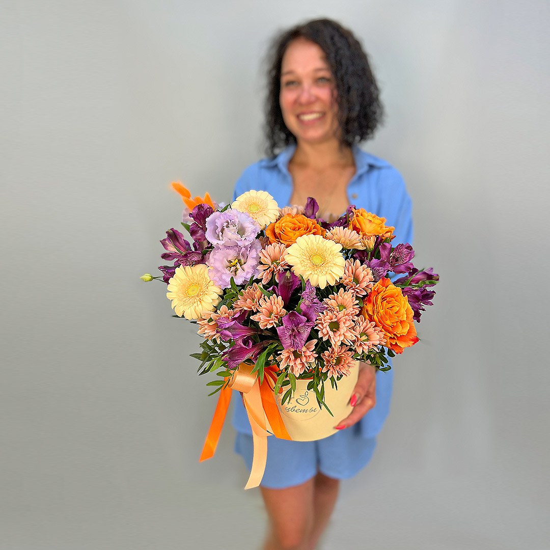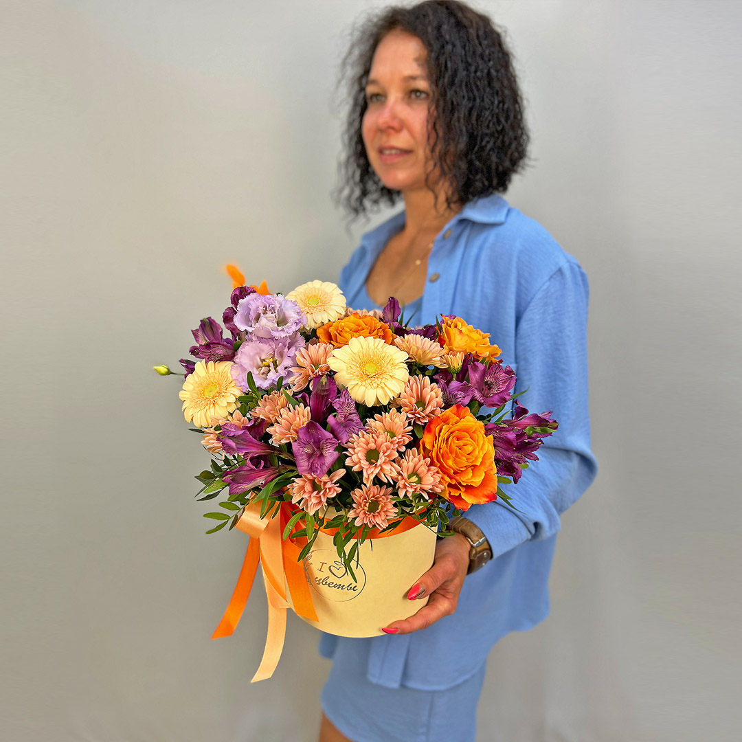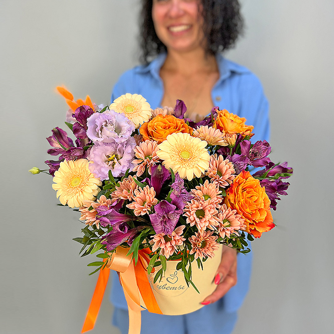 х Шляпная коробка с оранжевыми розами, герберами и альстромерией арт. 52460