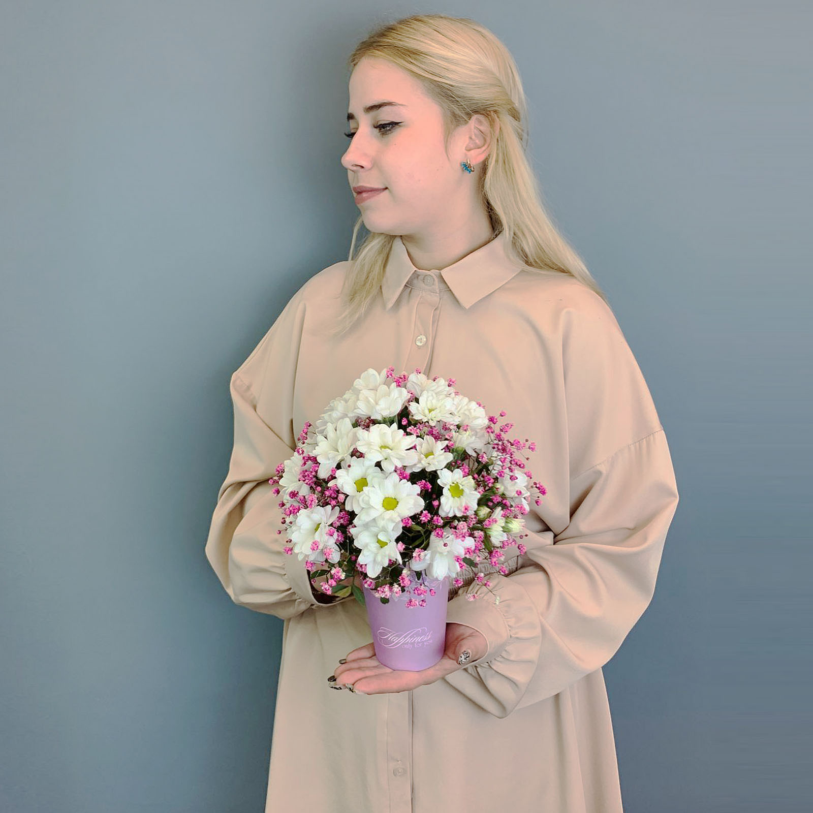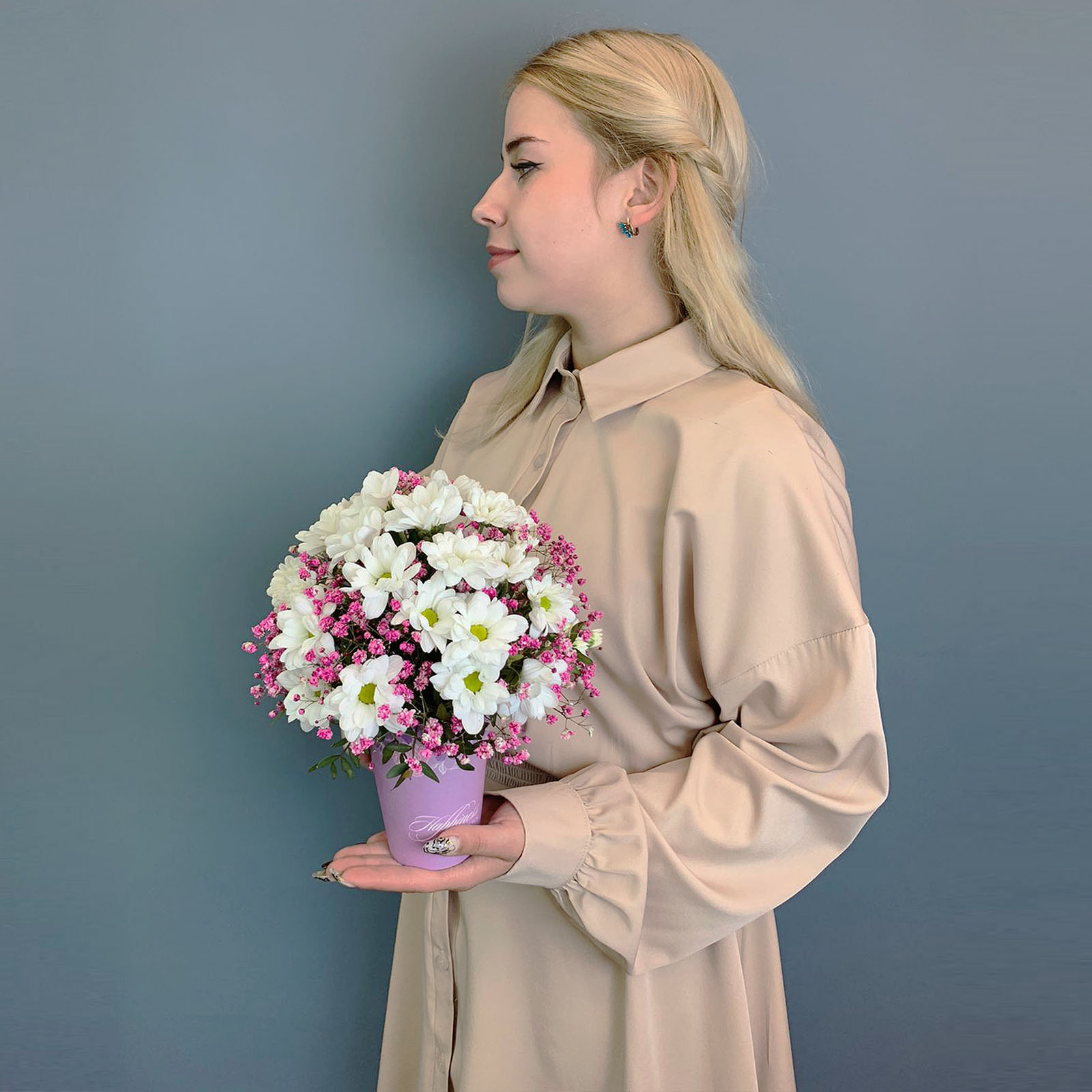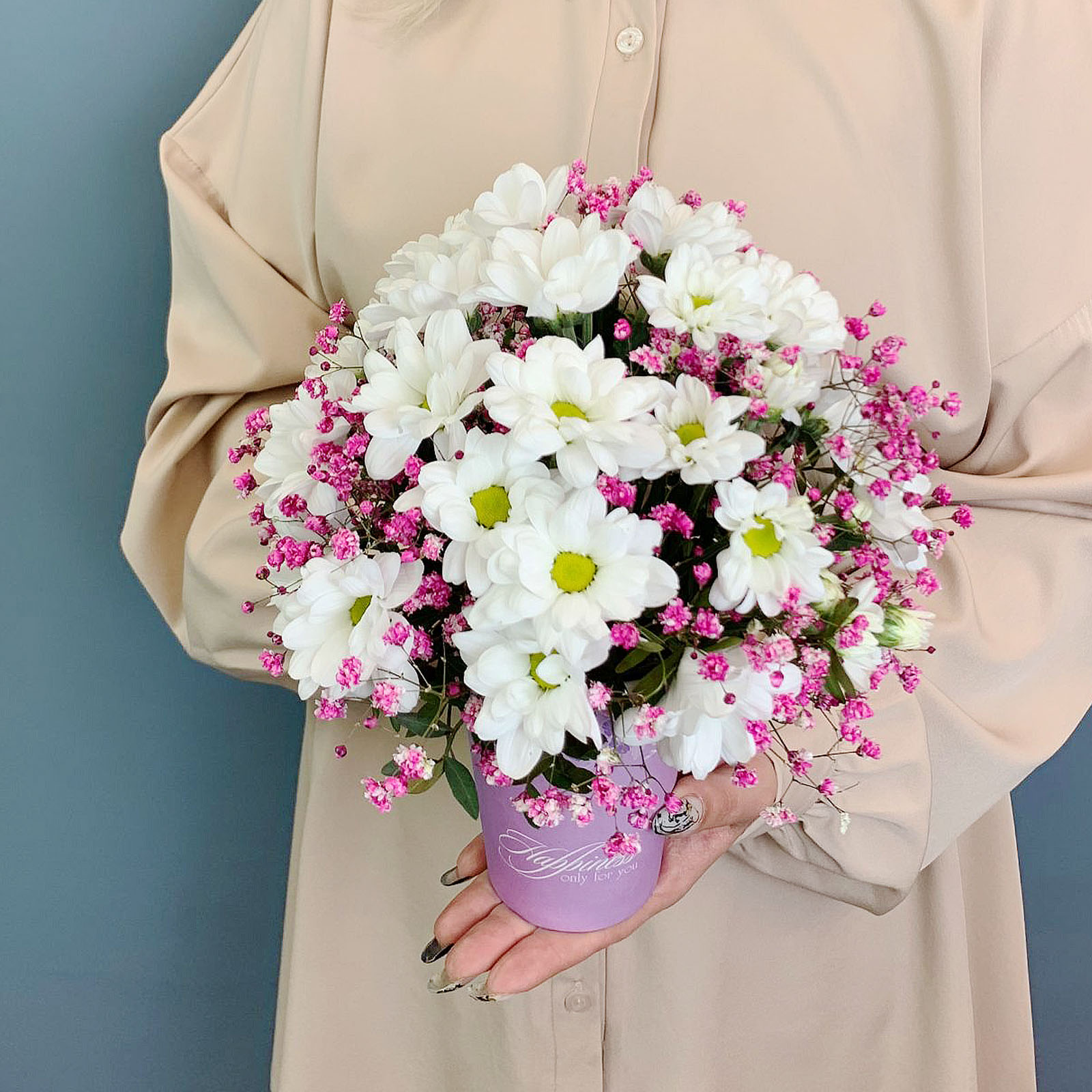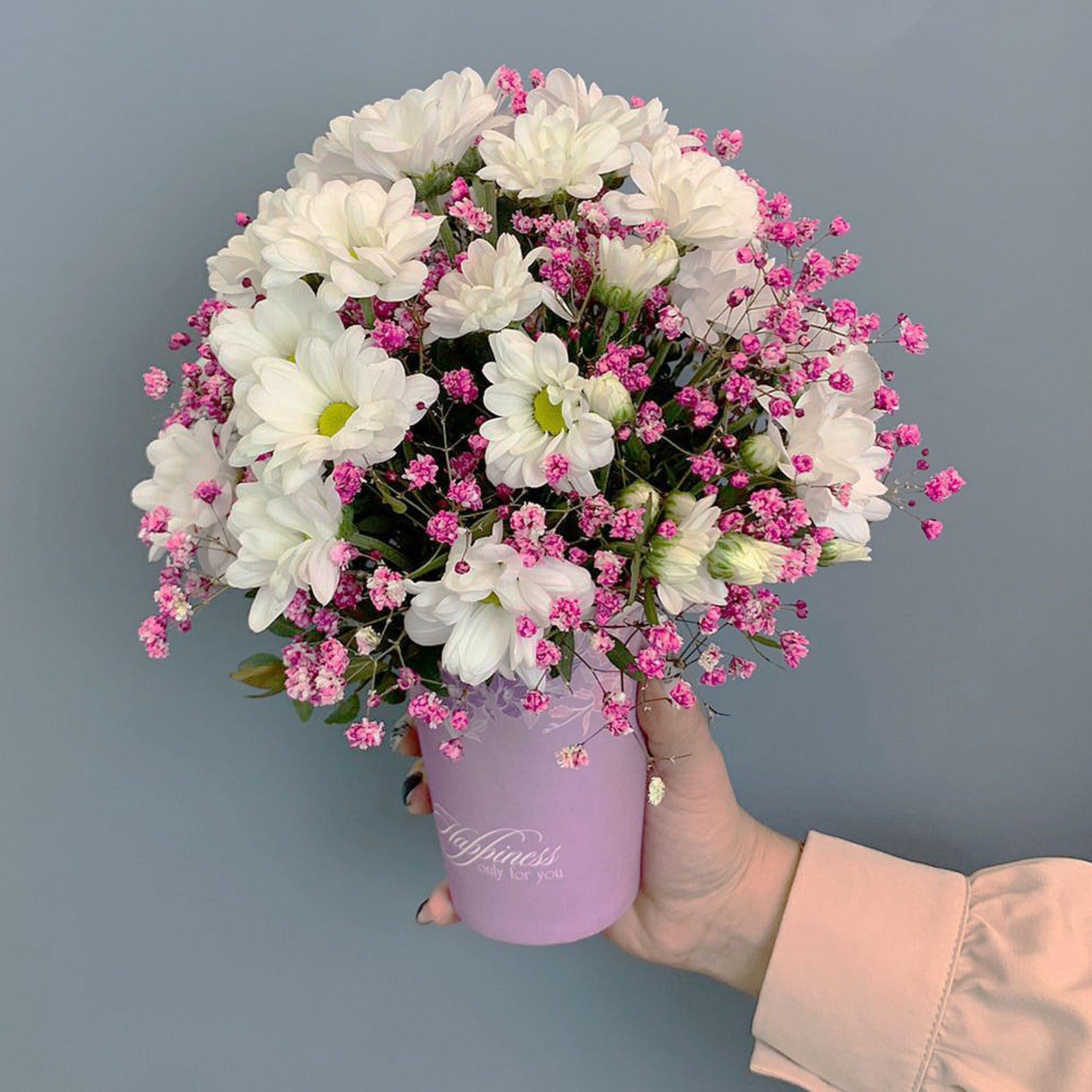 Цветы в стаканчике станут уместным выбором как букет на 1 сентября, так и для Дня воспитателя или в качестве тёплого комплимента «просто так». Мини-формат делает подарок особенно элегантным и нестандартным, ведь он легко вписывается в школьную атмосферу и не перегружает ребёнка. Нежные ромашковые хризантемы символизируют искренность и чистоту, а гипсофила добавляет воздушности и праздничного настроения.