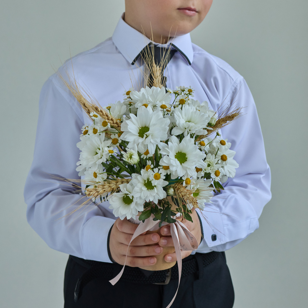 Этот букет на 1 сентября станет практичным решением для школьной линейки: он лёгкий, компактный и не требует вазы. Его можно подарить учителю, вручить ребёнку для торжественного фото — композиция подчеркнёт праздничность момента, сохраняя при этом комфорт и простоту. Такой формат особенно удобен для детей, ведь стаканчик не занимает много места и не доставляет хлопот.