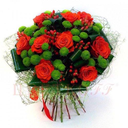 • х Букет "Огненная энергия" из крупной эквадорской розы, гиперикума и гермини. арт. 7628