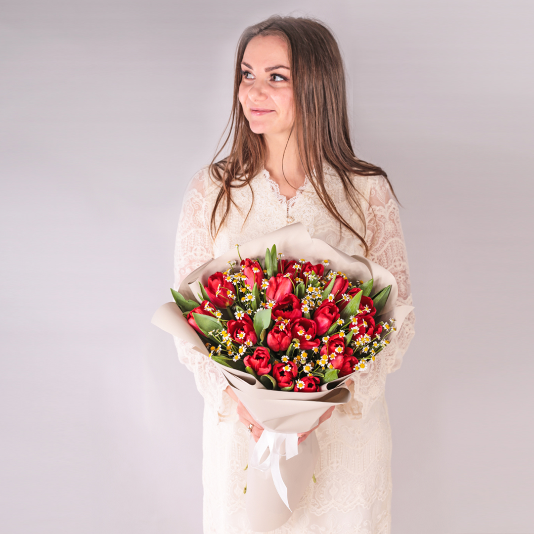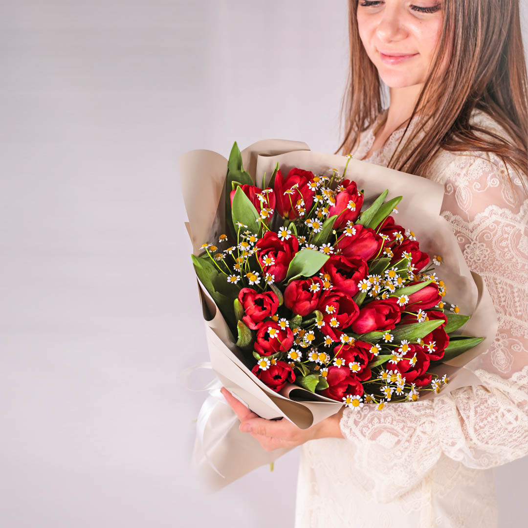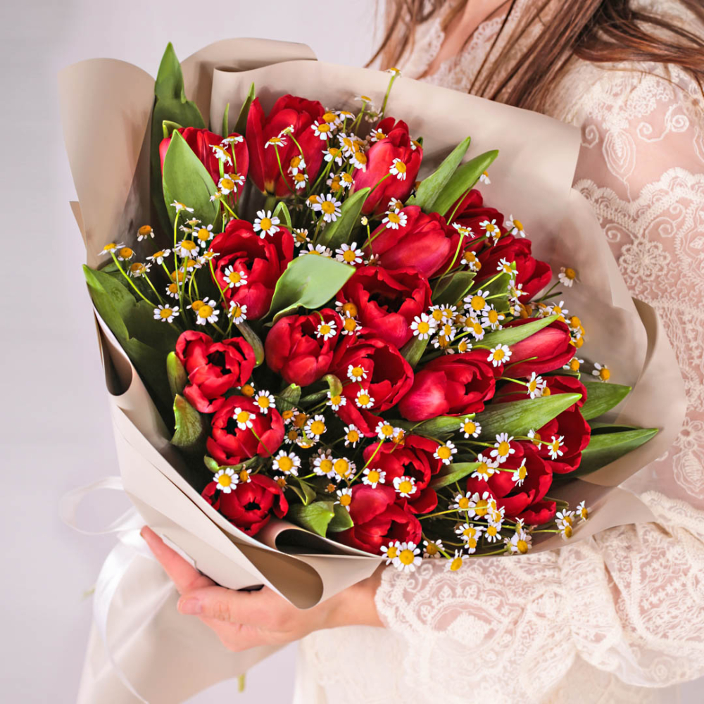 Букет из 19 красных тюльпанов с ромашками арт. 46334