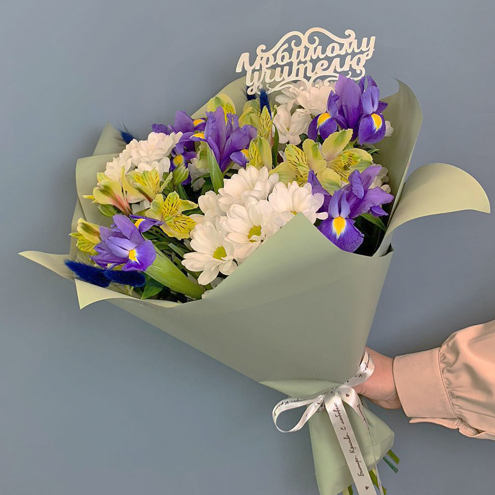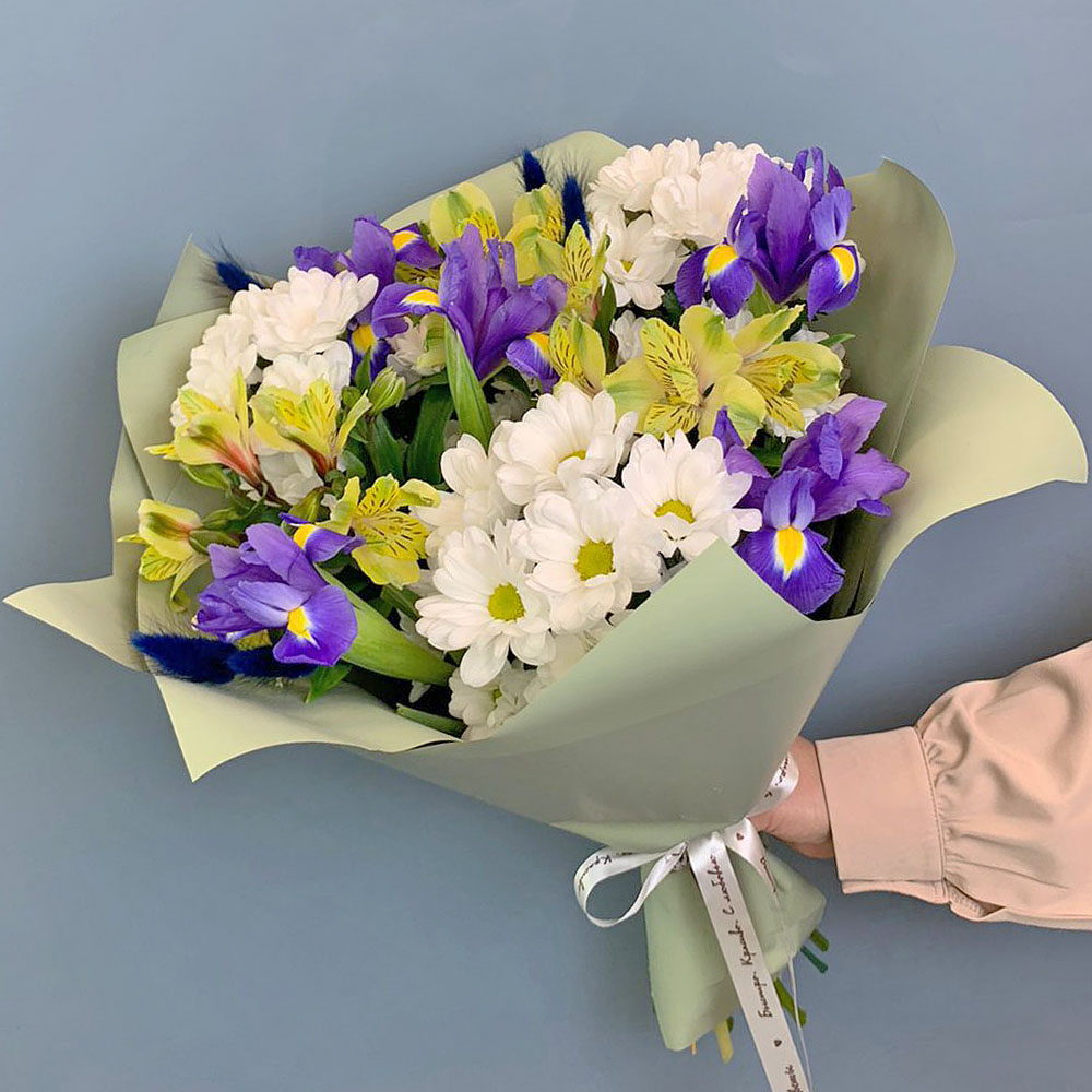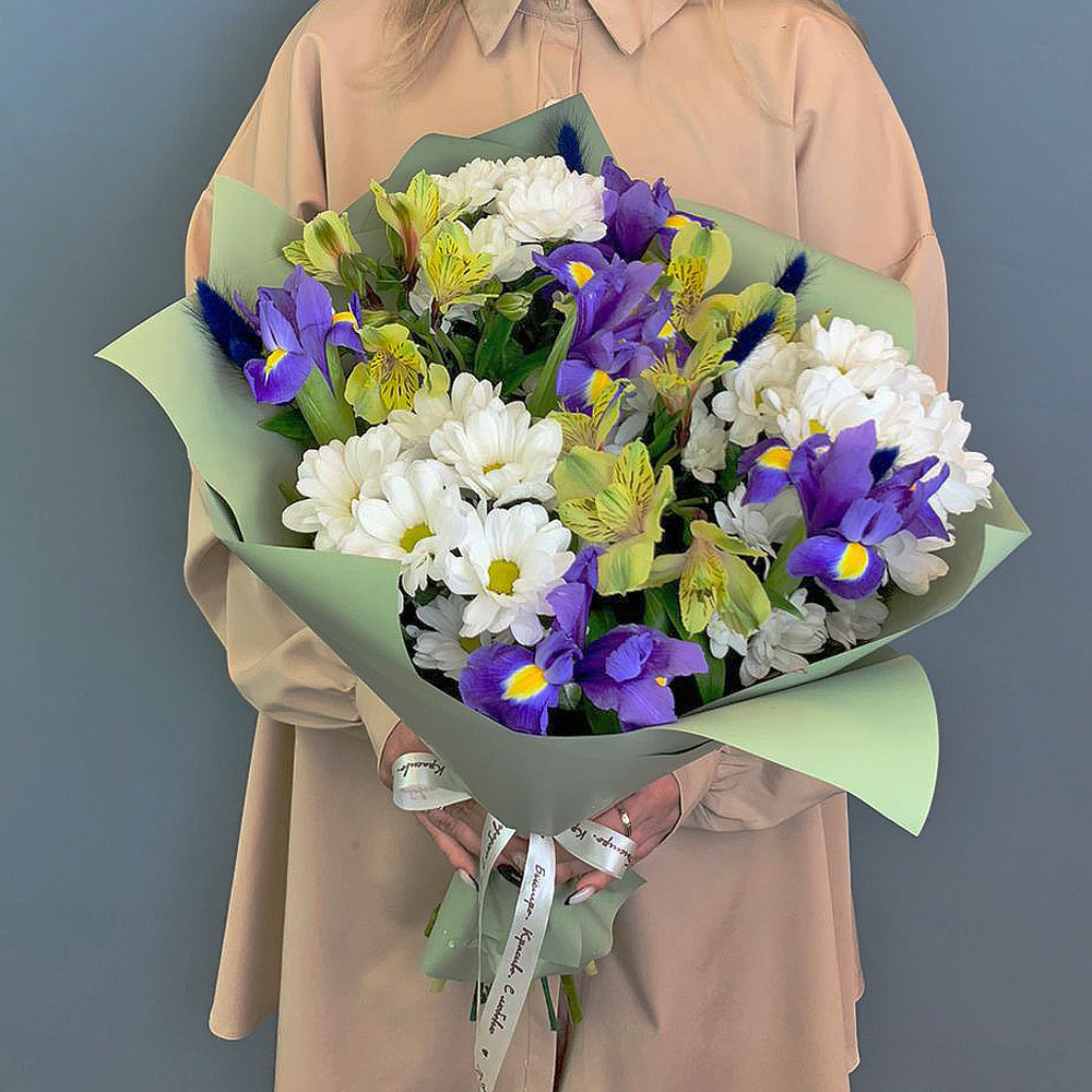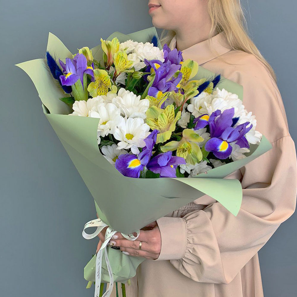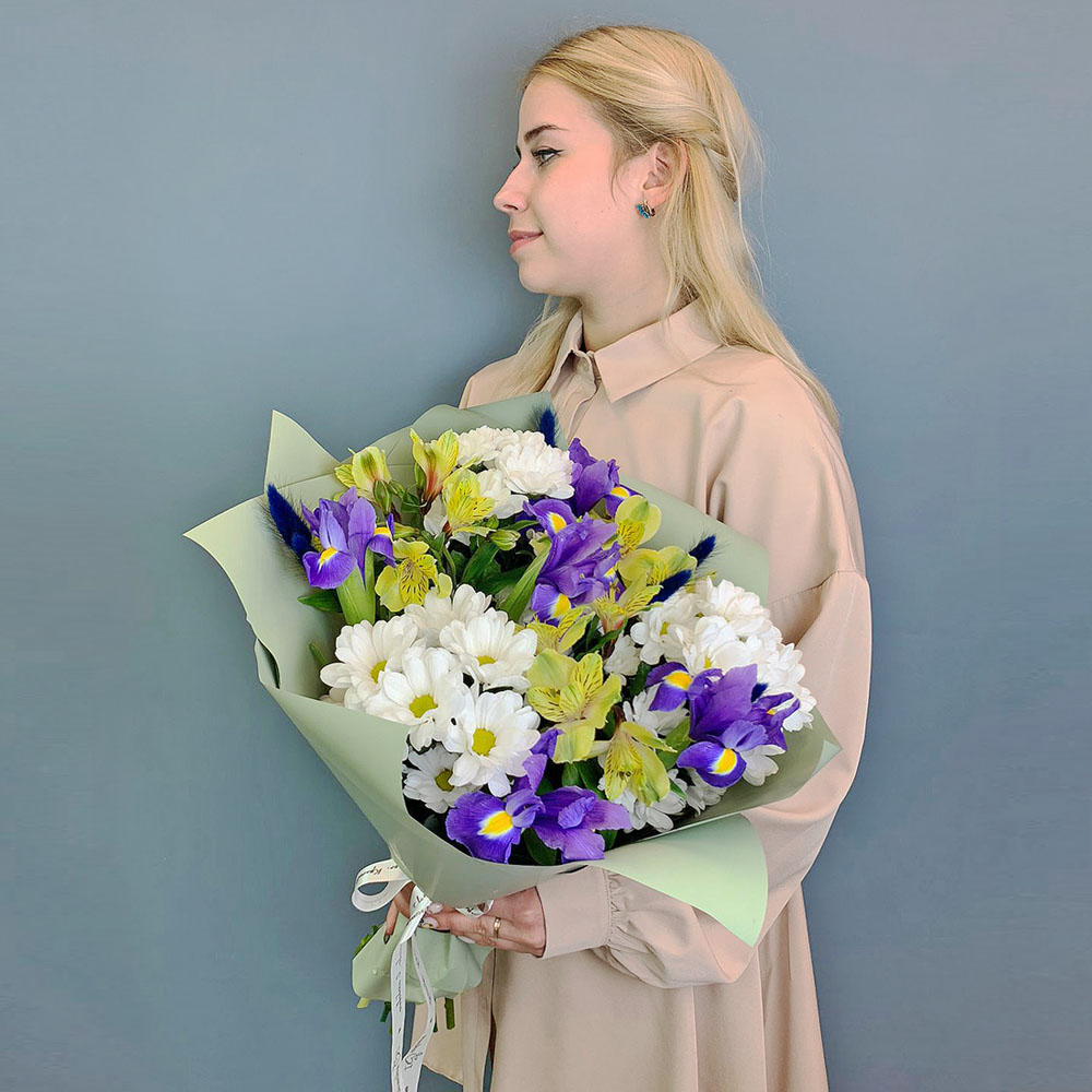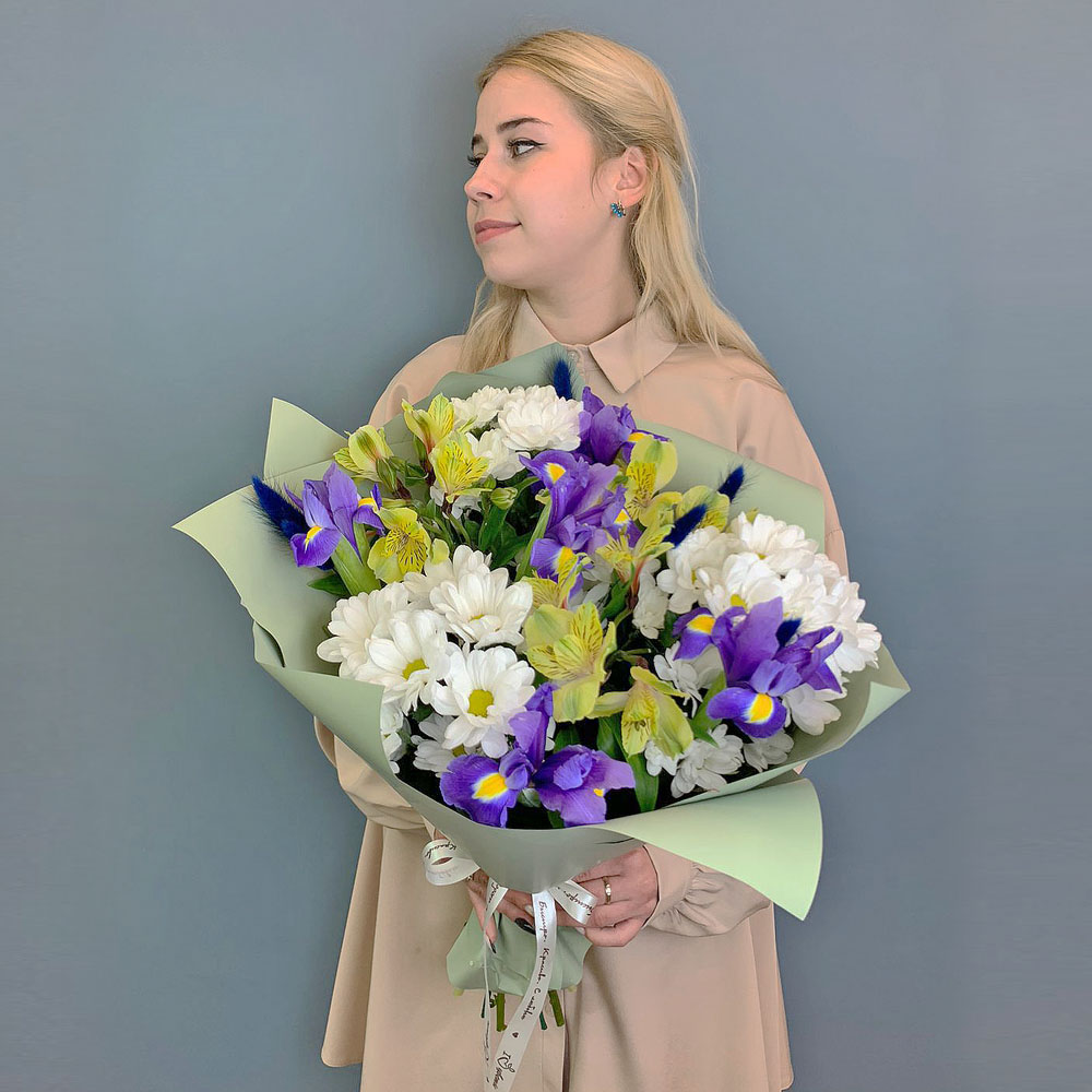 Букет из хризантем с ирисами и желтых альстромерией арт. 67002-Ж